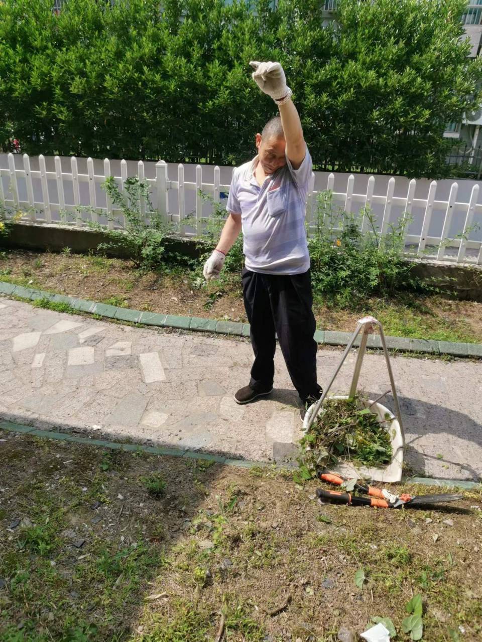 6月2日当天下午,在小区的绿化带内看到一个老大爷在清理小区的杂草和垃圾。正因为有着这样不拍苦不怕累的环卫工作者,使我们的城市更加美好!