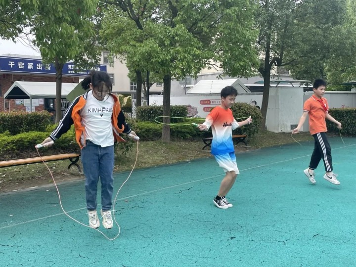 六年级同学们双手舞动,只见绳子不停地从他们的脚下一闪而过。而他们的脚就像是悬浮在空中一般,上下翻飞。真是一场激烈的比赛啊。