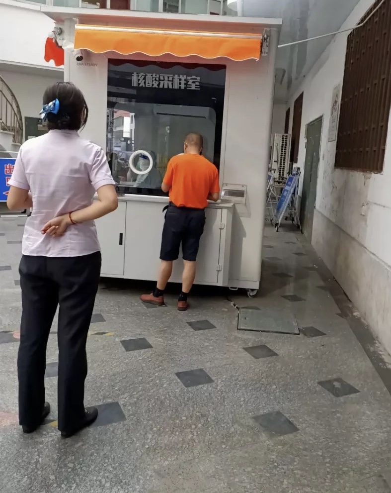 商城采样区内平桌被换成了一个小小的白房子。白房子外面是排队做核酸的人,里面是一刻不停采样的大白。白房子内外的人们都在为战疫胜利而努力着!